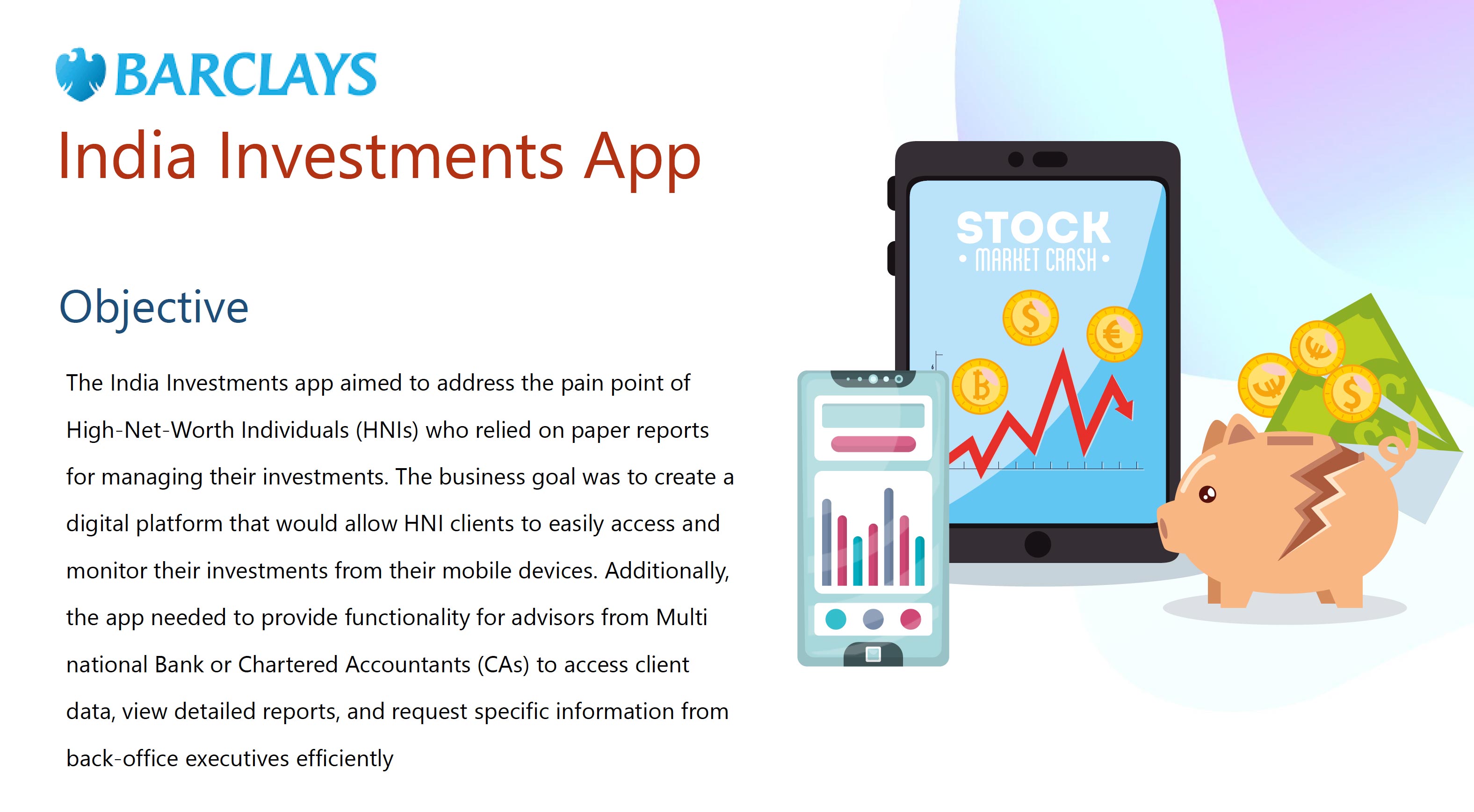 I served as the UX Lead, guiding the team through design thinking workshops, persona development, and usability testing. We designed an intuitive mobile experience that gave HNIs quick insights into gains, trends, and asset allocations—while enabling advisors and back-office staff to manage requests and reports efficiently.