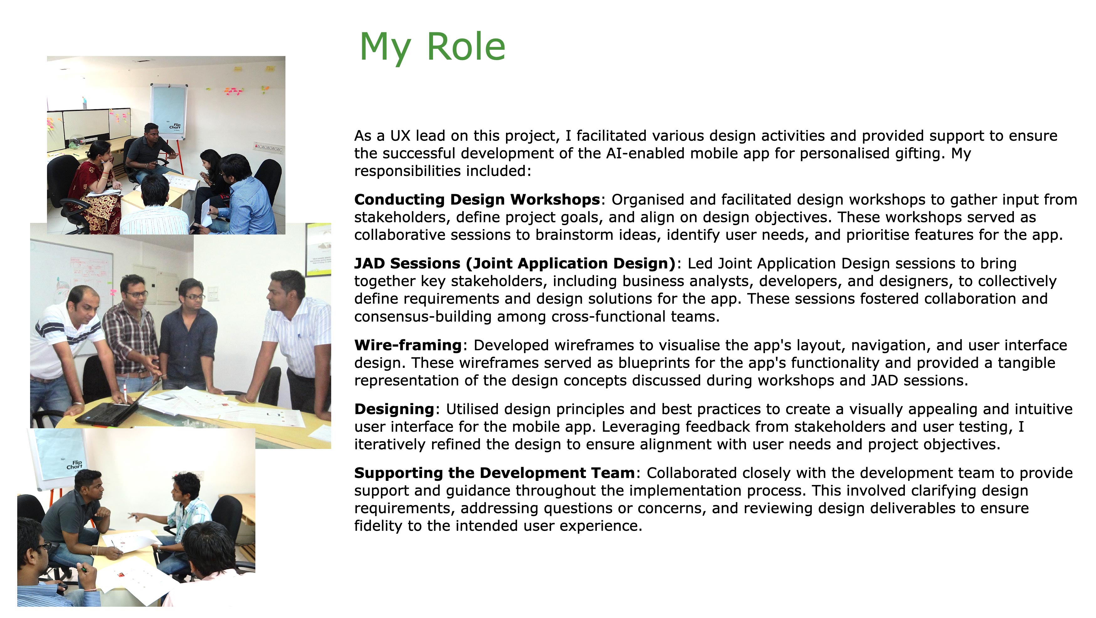 The design process followed an iterative approach, with rounds of feedback and usability testing to ensure the app felt intuitive, reliable, and visually appealing. The outcome was an elegant, AI-powered app that not only reduced the guesswork in gifting but also created a bridge between sentiment and smart shopping.